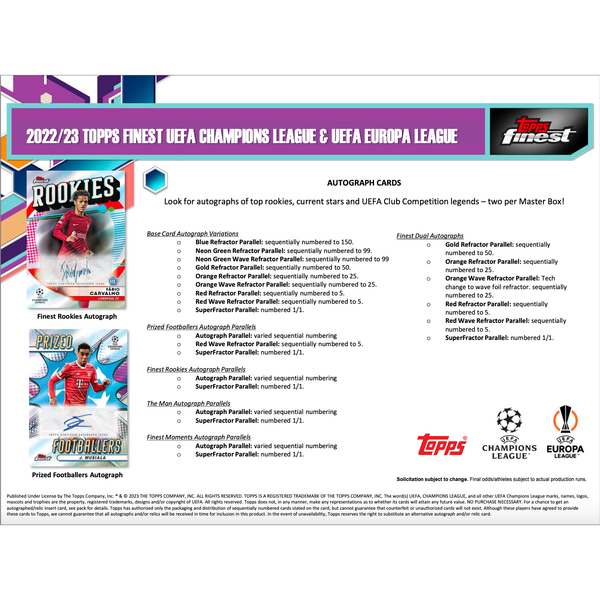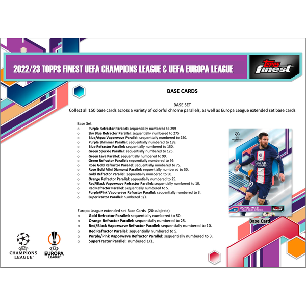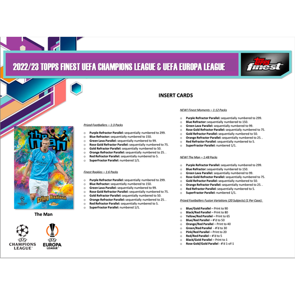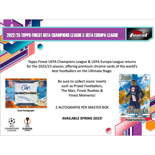 Topps Finest UEFA Champions League & UEFA Europa League returns for the 2022/23 season, offering premium chrome cards of the world's best footballers on the Ultimate Stage. Be sure to collect iconic inserts such as Prized Footballers, The Man, Finest Rookies & Finest Moments! - 6...