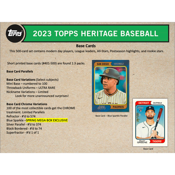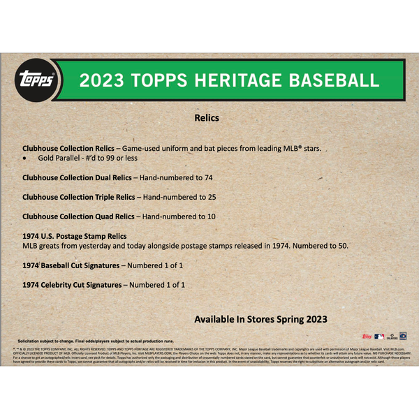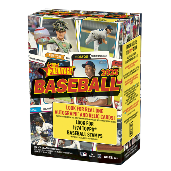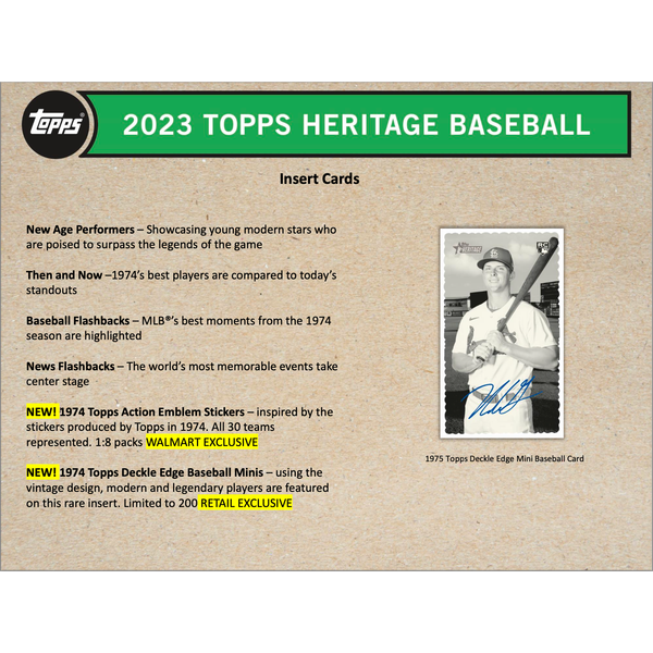 Each value box contains Eight (8) packs. Each pack contains Nine (9) 2022 Topps Heritage Baseball Cards. Each value box contains one (1) Retail-exclusive 1974 Stamps insert card. May contain Walmart-Exclusive 1974 Topps Stamps BLUE Parallel cards limited to 999.