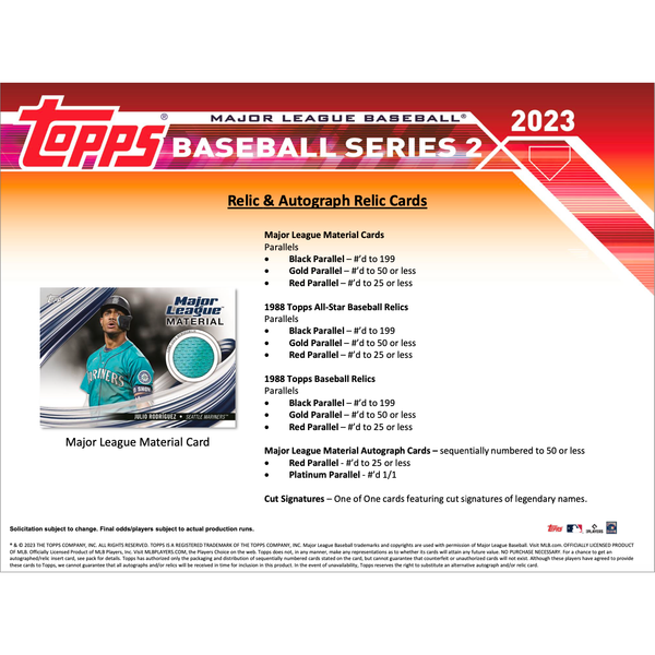 Each box contains seven (7) packs. Each pack contains fourteen (14) 2023 Topps Baseball Series 1 Cards. One (1) Exclusive Manufactured Relic Card per Box.